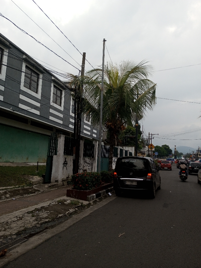 A street scene under an overcast sky shows a gray and white building behind a planter box. A palm tree grows next to the building. A black Honda car is parked on the side of the road. The street is filled with cars and motorbikes moving away from the viewer. In the distance, a mountain range is visible. Utility poles and wires are strung across the sky.