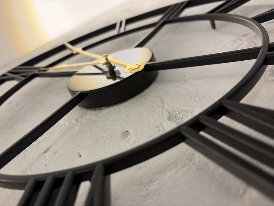 A close-up, low-angle shot showcases a black, oversized clock with Roman numerals against a textured white wall. The golden hands are positioned at roughly 11:15. The clock's face has a reflective surface, catching light. The depth of field is shallow, blurring portions of the clock and wall, emphasizing the tactile quality of the wall's surface.
