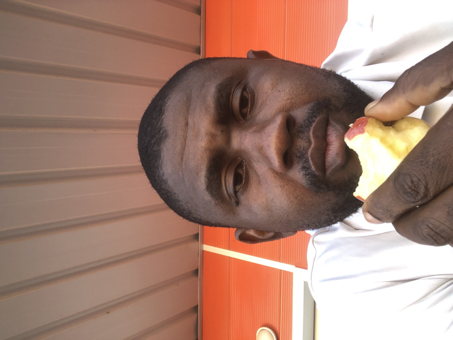 An adult male with dark skin, short dark hair, and a short beard is depicted in a close-up, chest-up view, looking directly at the camera