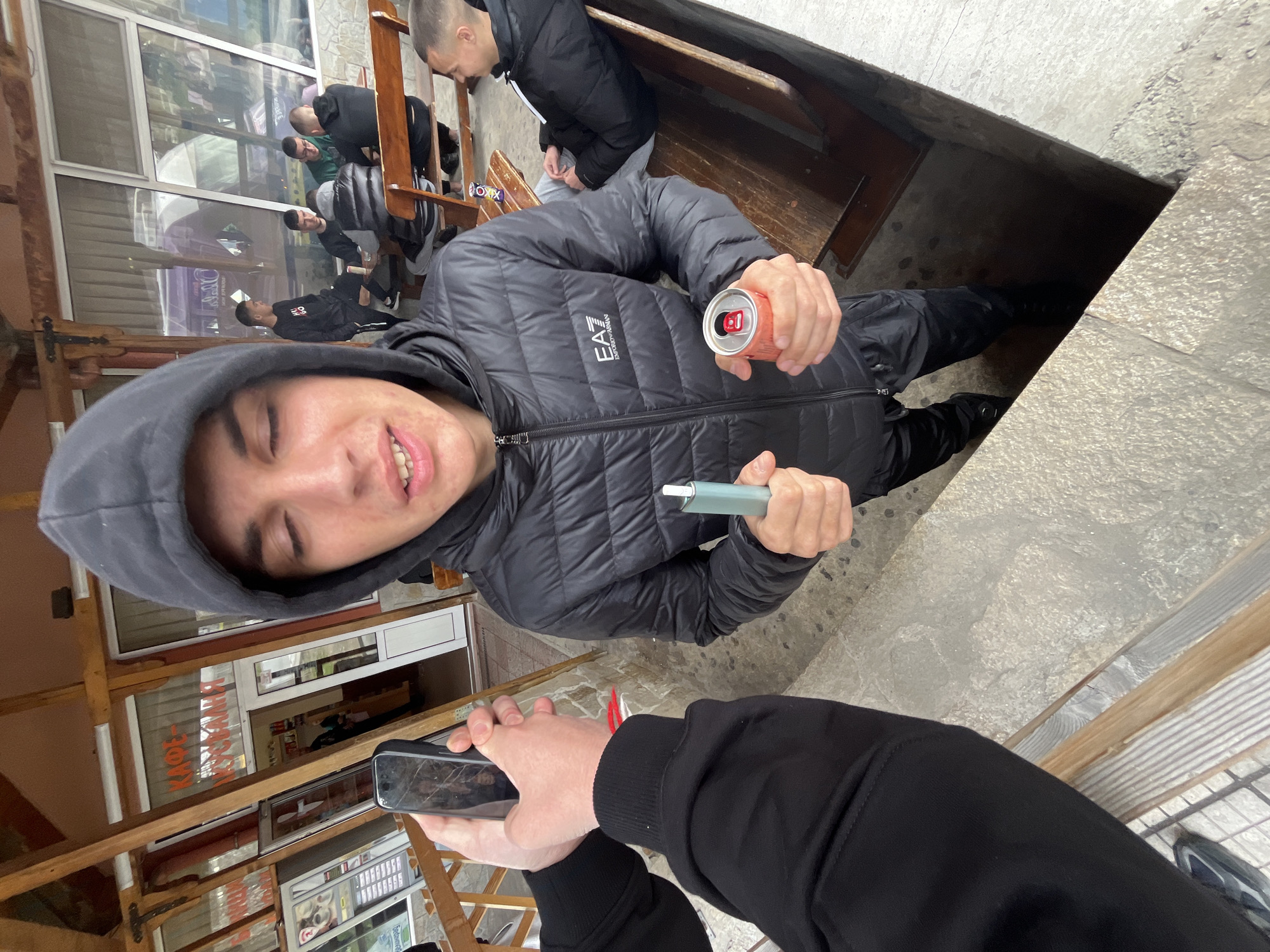 The image depicts a semi-enclosed outdoor seating area of a cafe in Asenovgrad, Bulgaria. In the foreground, hands holding a smartphone with a cracked screen are visible, indicating the perspective of the photographer. A young male, approximately late teens to early twenties, stands in the midground, slightly below the level of the photographer. He is wearing a black hooded puffer jacket with an "EA7 EMPORIO ARMANI" logo on the chest, and black trousers. His hood is up, and his eyes are partially closed or downcast, with his mouth slightly open. He holds a light blue/grey cylindrical device, consistent with a vaping or heated tobacco product, in his right hand, and an open red beverage can, likely an energy drink, in his left hand. In the background to the right, a group of five to six young males are seated at a wooden table with wooden benches. They are dressed in casual dark clothing. One individual on the far right bench has a short haircut. A red and white object is visible on the ground near the bench. The background to the left features the cafe's structure, constructed with wooden beams and large glass windows. Through the windows, a red sign with Cyrillic script is visible, partially reading "КАФЕ-КЛУБА" (CAFE-CLUB). Display cases or vending machines are also visible through the far-left windows. The ground throughout the scene is concrete.