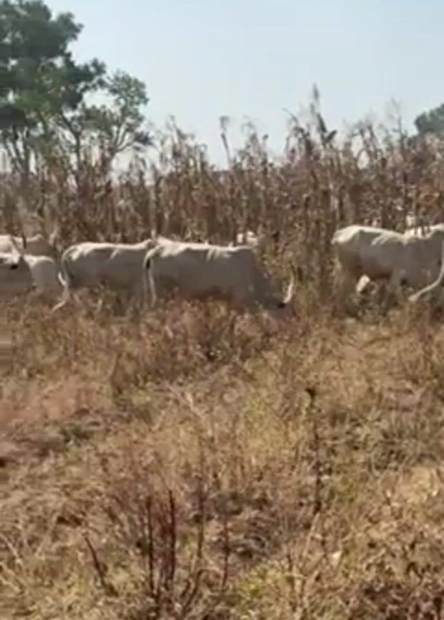 A herd of light-colored cattle grazes in a field of dry vegetation under a clear, blue sky. The cattle are mostly obscured by the tall, dry plants, likely corn stalks, giving the impression that they are moving through a field of brown. Trees are sparsely scattered in the background. A figure on what appears to be a bicycle is seen briefly towards the left of the frame, overseeing the cattle. The ground is dry and dusty, indicative of a dry season or arid climate.
