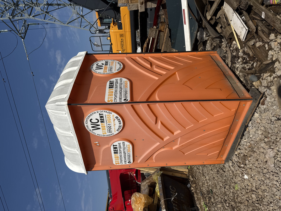 An orange portable chemical toilet, featuring a white, sloped roof and molded plastic panels, stands on a gravel surface under a clear blue sky in German, Bulgaria