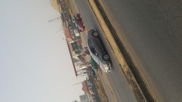 The image depicts an outdoor urban scene in Kugbo, Nigeria, on what appears to be a multi-lane paved road under a hazy sky