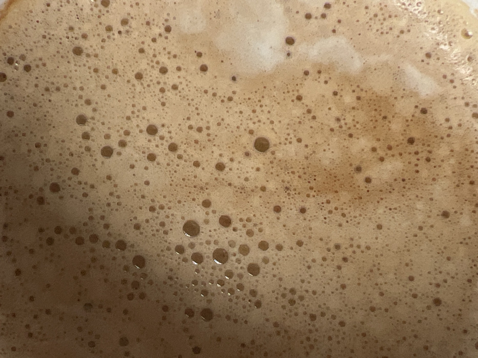 - "The image displays a high-magnification, overhead view of the foamy surface of a light brown liquid, consistent with a beverage such as coffee or a latte" by FM-n2Vts1, licensed under CC BY 4.0