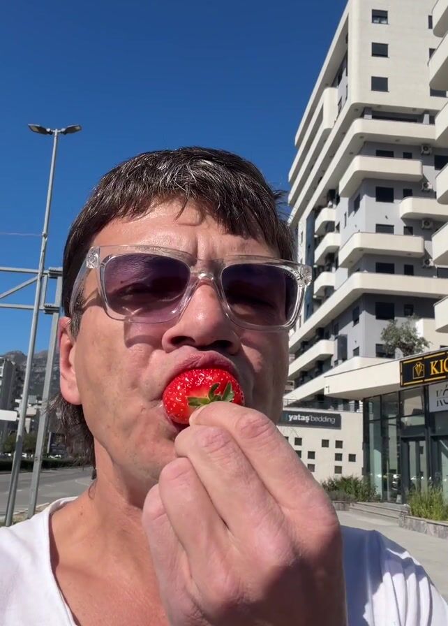 A man in sunglasses and a white t-shirt bites into a strawberry while standing outside on a sunny day. Behind him is a street, a tall white building with many windows and air conditioning units, and mountains in the distance. The man chews, swallows, and says "Good".