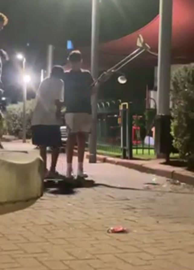 At night, in an outdoor public space paved with rectangular bricks, three young men are visible. One of them manipulates a large slingshot-like contraption. He pulls back on the device and then releases it, launching something unidentifiable. The projectile leaves a white streak in the air as it flies offscreen. The device operator then reacts to the launch. The surrounding environment is dotted with tall poles with globe lights affixed to them. Beyond these poles, one can see a structure with a red canopy. Foliage is also visible. Litter, notably what appears to be a discarded candy wrapper, lies on the brick paving.