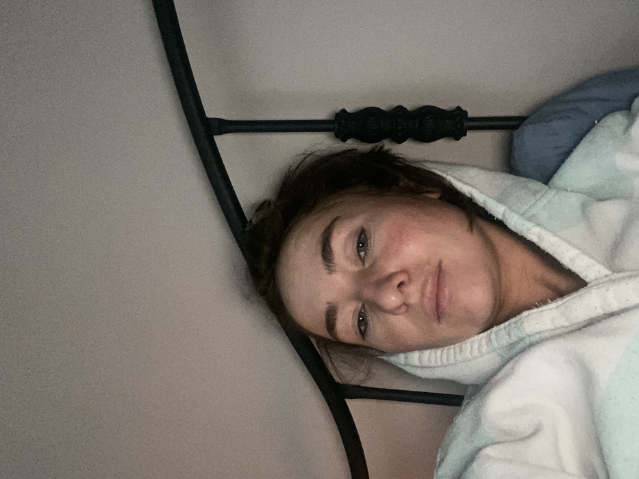This image presents a close-up, upward-angled view of an adult female individual situated in an indoor setting, identified as Ust-Ilimsk, Russia. The subject is reclined, looking directly at the camera with a neutral expression. Her dark brown hair appears casually styled or pulled back. She is wearing a hooded garment, predominantly white with light blue or green segmented patterns. To the right of the individual, a dark-colored, likely metal, ornamental bed frame is visible, featuring a horizontal bar and a vertical support detailed with stacked, rounded decorative elements. A light blue fabric, consistent with a blanket or pillow, is partially visible beneath the subject on the right. The background consists of a plain, light-colored surface, presumably a wall or ceiling. The scene is illuminated by dim, ambient lighting.