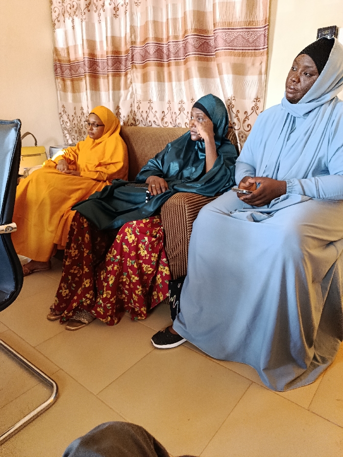 The image displays an indoor scene in the city of Unknown, Unknown, featuring three adult females seated. All individuals wear head coverings and loose-fitting garments. From left to right: The first woman wears a yellow hijab and a long yellow dress, seated on a brown, ribbed sofa. She has spectacles on and her hands are clasped in her lap. She is partially obscured by a dark-colored chair with a metallic frame in the foreground. The second woman, seated next to her on the same sofa, wears a dark teal hijab and a matching long-sleeved garment over a red skirt with yellow floral patterns. Her right hand is near her face, while her left hand rests on her lap, holding a string of white prayer beads. Gold-colored flat shoes are visible on her feet. The third woman, seated to the right, wears a light blue hijab and a matching light blue long dress. She holds a silver-colored smartphone in her right hand. A black sneaker with a white sole is visible on her right foot. All three women are looking towards the left side of the frame. The background features light-colored curtains with a decorative brown and cream pattern, hanging against a plain light-colored wall. A yellow shoulder bag is visible behind the leftmost woman. The floor is covered with light-colored square tiles.