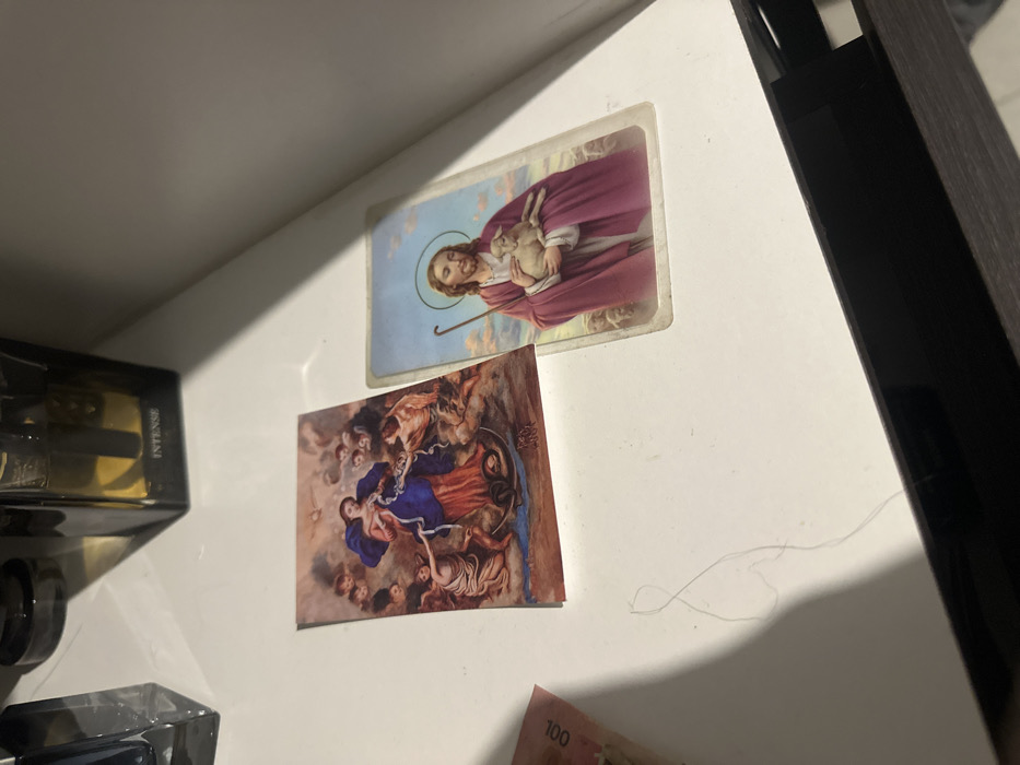 Two religious cards are attached to a white surface. The top card depicts Jesus Christ holding a lamb, with a halo around his head. Below is a card featuring the Virgin Mary standing on a snake, surrounded by angels. A partially visible object, possibly a perfume bottle, is on the left. The corner of a 100 currency note is visible at the bottom. Some strands of hair are scattered nearby.