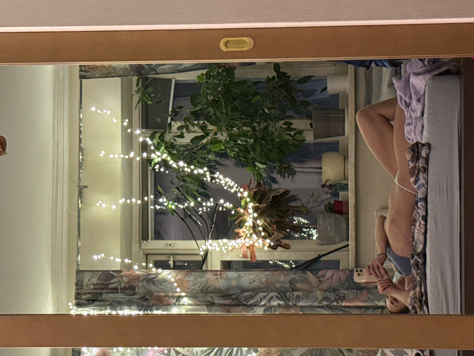 The photo is a mirror reflection. Outside the window is a houseplant surrounded by string lights. Inside the room, a woman stands on a bed, facing the mirror and holding a phone to take a picture of herself. She is wearing a small thong. Part of a bed with patterned sheets is visible to the right. A candle, vase, and other decorative items are also reflected on a shelf.