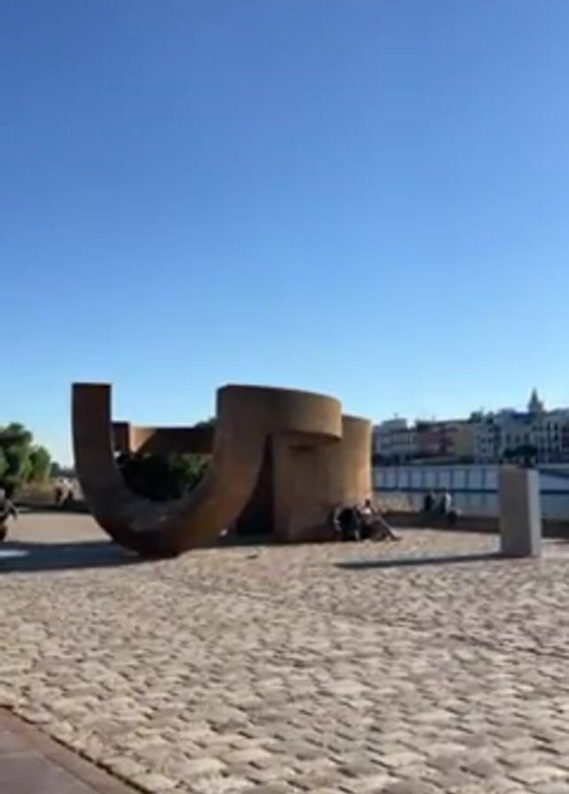 A sunny outdoor scene depicts a paved plaza with a large, abstract sculpture made of weathered, dark brown material