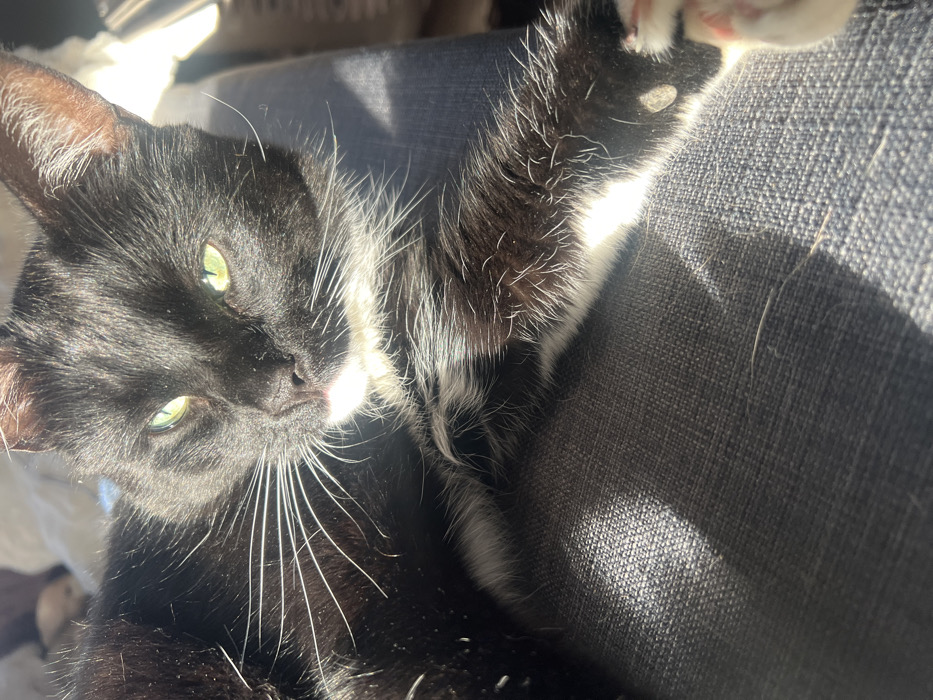- "The image displays a domestic cat, identified as a tuxedo pattern, with predominantly black fur and white markings on its chest, chin, and front paws" by FM-XA2Is1, licensed under CC BY 4.0