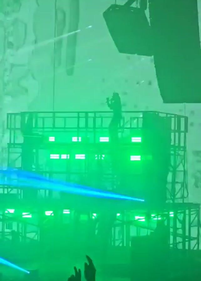 The video captures a live concert from a low angle, emphasizing the stage setup and performance. A figure is seen on a multi-tiered metal platform under bright green stage lighting. Additional beams of blue light move across the stage. The stage lights create a hazy atmosphere, and there’s a massive speaker setup hanging above the platform. The audience is visible at the bottom of the frame with raised hands, suggesting active engagement with the show. Pyrotechnics appear with flashes of orange fire on the stage, momentarily illuminating the scene.
