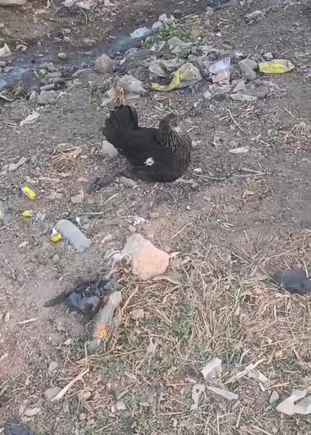black hen with small white chickens sheltering underneath her. They are in a littered area with rocks, dirt, grass, and trash scattered around. There's a stream of water visible in the background and some smoke. The hen is still, appearing to protect her chicks. Distant voices are audible.