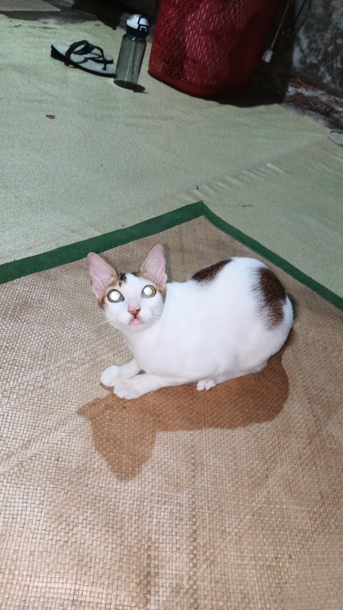 A domestic cat is observed in an indoor setting in Mns Alue, Indonesia. The cat, exhibiting primarily white fur with distinct brown patches on its back and head, is positioned on a light brown woven mat. Its body is oriented towards the viewer, with its front paws tucked beneath its chest. The cat's eyes display a prominent retroreflective effect, appearing as bright, glowing circles, consistent with flash photography. In the background, to the upper left, a single white flip-flop with black straps is visible, adjacent to a clear plastic water bottle with a dark and white cap. Further to the right, a portion of a red mesh bag is present. The flooring consists of two types of mats: a woven tan mat in the foreground and a light green mat with a dark green border in the upper left, partially covered by the woven mat. The ambient lighting appears dim, evidenced by the cat's eye reflection.
