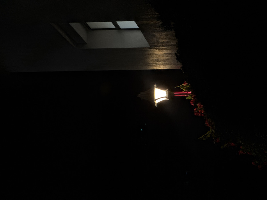 At night, a partially visible skylight glows subtly above. Below, a vintage lantern shines brightly, illuminating nearby red flowers and greenery. The background is dominated by deep shadows, contrasting sharply with the light sources. The scene evokes a sense of tranquility and mystery.
