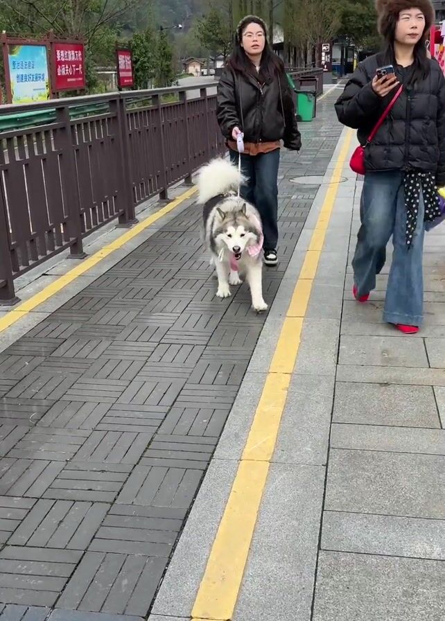 Two women walk along a stone walkway with two large dogs. The dogs are similar in size and breed, resembling Alaskan Malamutes or Huskies. The woman on the left walks a gray and white dog wearing a pink gingham bib. The woman on the right walks a brown and white dog with a blue backpack. Both dogs are panting, tongues out. Pedestrians pass by in both directions. The walkway has a yellow line down its center. A metal fence runs along the left side of the walkway. In the background, across a small river or canal, is a traditional Chinese-style building. Banners with Chinese characters are visible on the fence. The weather appears overcast.
