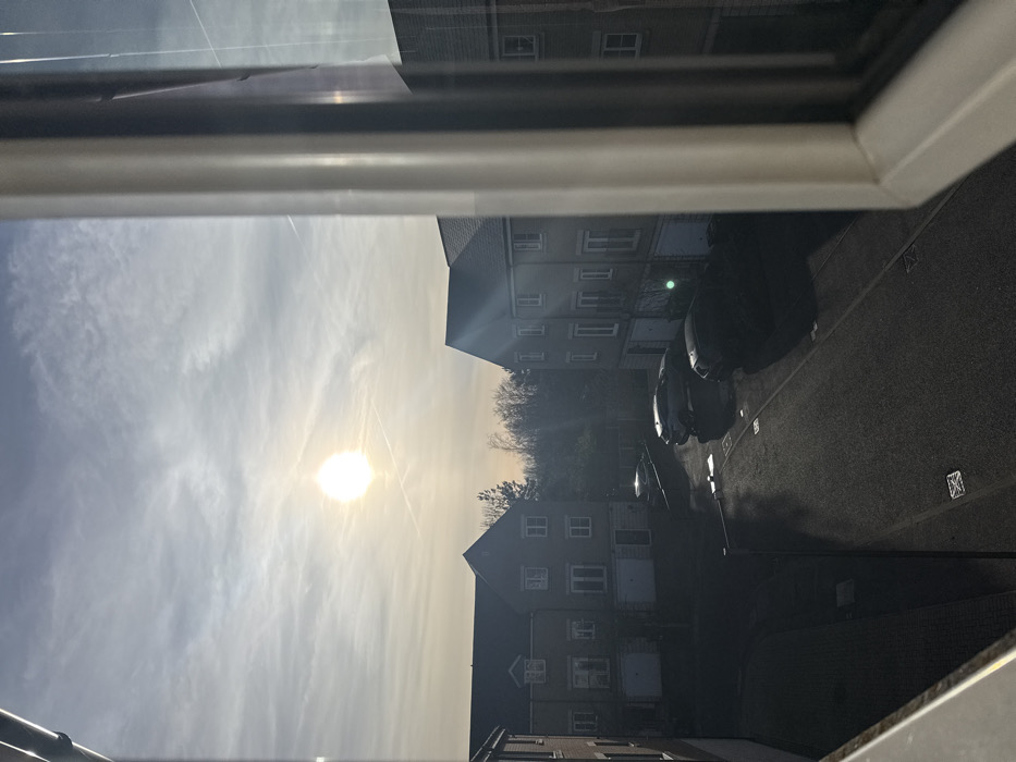 The image depicts an exterior view of a modern residential housing estate, observed from an elevated indoor position through a window. The window frame, including a white vertical mullion, is visible on the right and partially on the left. The sky occupies the upper portion, exhibiting a bright sun positioned centrally, causing significant lens flare and glare. Wispy, thin clouds are present, along with a faint contrail visible horizontally below the sun. The time of day appears to be morning or late afternoon due to the low sun angle and resultant long shadows. In the mid-ground and background, multiple two-story residential buildings are visible. These structures feature light-colored facades (likely render or light brick) and dark, pitched roofs. Several ground-floor garage doors or entrances are discernible on the buildings. An asphalt cul-de-sac or private road traverses the scene, with marked parking bays. At least four passenger vehicles, predominantly dark-colored cars or SUVs, are parked on the road and in designated bays. A single street lamp post is visible in the middle-ground, casting a long shadow. Patches of green space or low vegetation are present along the road and building perimeters. Beyond the buildings and road, a dense line of deciduous trees, currently bare, forms the horizon, indicating an autumn or winter season. The overall scene is static; no individuals are present, nor are any actions or interactions depicted. The environment is consistent with a modern suburban residential development located in Great Yarmouth, United Kingdom. The exact street address or specific estate within Great Yarmouth cannot be determined from the visual information alone.