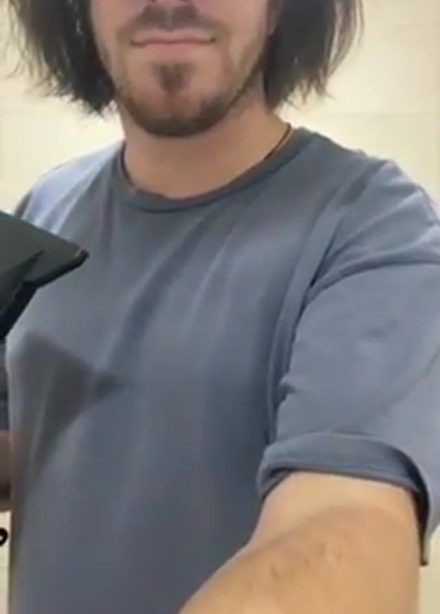 A man with shoulder-length brown hair and wearing glasses and a blue t-shirt is blow-drying his hair in a bathroom