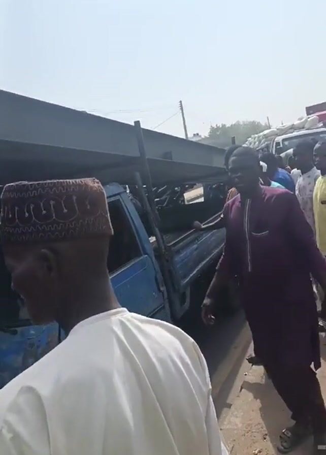A blue truck has overturned on a road, and a crowd of people is gathered around it. The truck's bed is filled with what appear to be steel beams. The sky is light, and the location seems to be an urban street with other vehicles visible in the background. Some of the people are looking at the truck, while others are looking around or talking. Many are wearing traditional African clothing. The overall scene suggests an accident or mishap that has attracted attention.