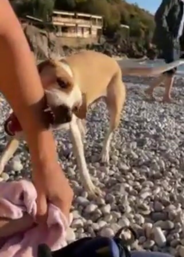 tan and white dog playfully nipping at a person's arm on a rocky beach. The person, wearing yellow pants, is holding a pink towel and trying to dry their arm. A blue athletic shoe sits nearby on the ground. In the background, a man walks barefoot near the water's edge. The beach is covered in small, smooth rocks. A building is partially visible in the background on a tree-covered hill. The sky is blue with a few clouds.