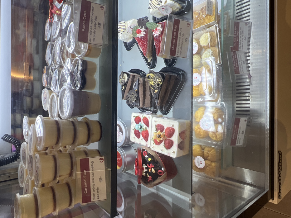This image depicts a three-tiered refrigerated glass display case showcasing various desserts and baked goods inside a commercial establishment in Ho Chi Minh City, Vietnam