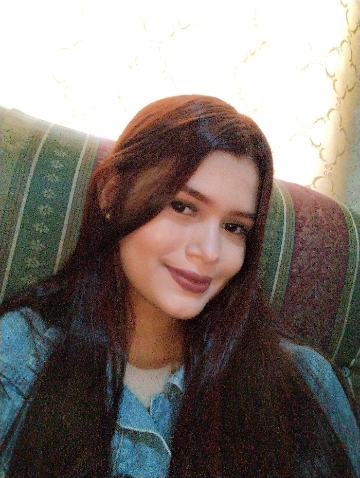 A young woman with long, reddish-brown hair smiles slightly at the camera