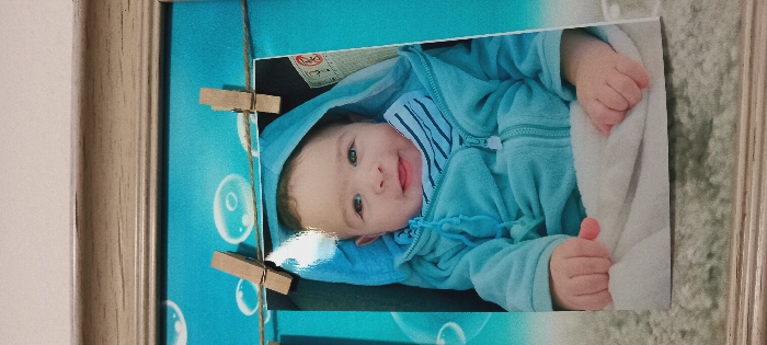 A single photograph of an infant is vertically centered within a light-colored wooden frame, displayed against a light-colored wall. The photograph, measuring approximately 12 inches high by 8 inches wide, is suspended by two miniature wooden clothespins gripping its top edge, attached to a thin, light-brown string stretched horizontally across a larger, blue background print featuring white circular bubble designs. The infant depicted in the photograph has fair skin, dark hair, and brown eyes, with dimples on the cheeks. The child is wearing a light-blue hooded fleece jacket with a white zipper and a white frog-shaped zipper pull, over a white and blue striped long-sleeved shirt. The infant is smiling, with the tongue slightly protruding, and looking directly towards the viewer. Both hands are visible, lightly gripping a white, soft blanket or cloth draped over the lower body. The background within the photograph appears to be a dark, solid color, possibly indicating a car seat or similar carrier. The wooden frame has a distressed, off-white or light-beige finish. Below the photograph and frame, a textured, light-green or light-grey carpet or fabric surface is visible. The specific location in the city of Meknes, Morocco, cannot be determined from the visual information present in the image.