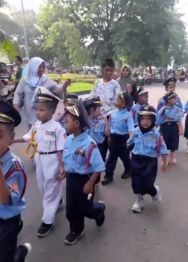 A group of children dressed in aviation themed costumes walk along a street in a loose group. Some of the children wear dark pants, light blue shirts, and dark caps with gold trim. One child wears a white uniform with a white cap. Several adults accompany the children, two wearing hijabs. A large tree stands in the background, and parked motorcycles are visible behind the group. Some of the children are blowing whistles.