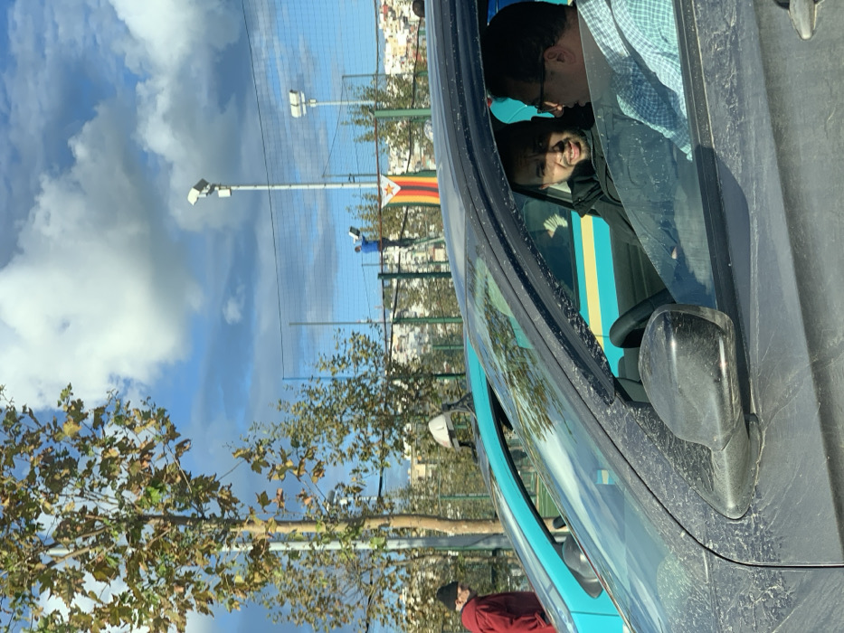 This image captures an urban scene in Tangier, Morocco, under a partly cloudy blue sky. In the immediate foreground, a dark-colored sedan exhibits a dusty exterior, particularly visible on its hood and side mirror. Inside, the driver, a male with dark hair and beard, wearing a dark jacket, is turned towards the passenger, a male wearing glasses and a light-colored plaid shirt. Both individuals are engaged in an interaction, with the driver's mouth open as if speaking or reacting. The driver's side window is down. Mid-ground to the left, a male wearing a red jacket and a black beanie stands near a light blue/turquoise car, partially obscured by the foreground vehicle. A yellow horizontal stripe is visible on the side of the turquoise vehicle. In the background, an outdoor sports court is visible, enclosed by a tall green mesh fence. Two prominent tall light poles with multiple floodlights illuminate the court area. On the left light pole, a male wearing a blue shirt is positioned on a step ladder, actively adjusting or working on one of the floodlights. Attached to the fence, between the two light poles, is a banner or flag featuring red, yellow, and black horizontal stripes, with a red star centered on the yellow stripe. Beyond the sports court fence, numerous white or light-colored buildings ascend a distant hillside. Sparse-leaved deciduous trees are also visible throughout the scene.