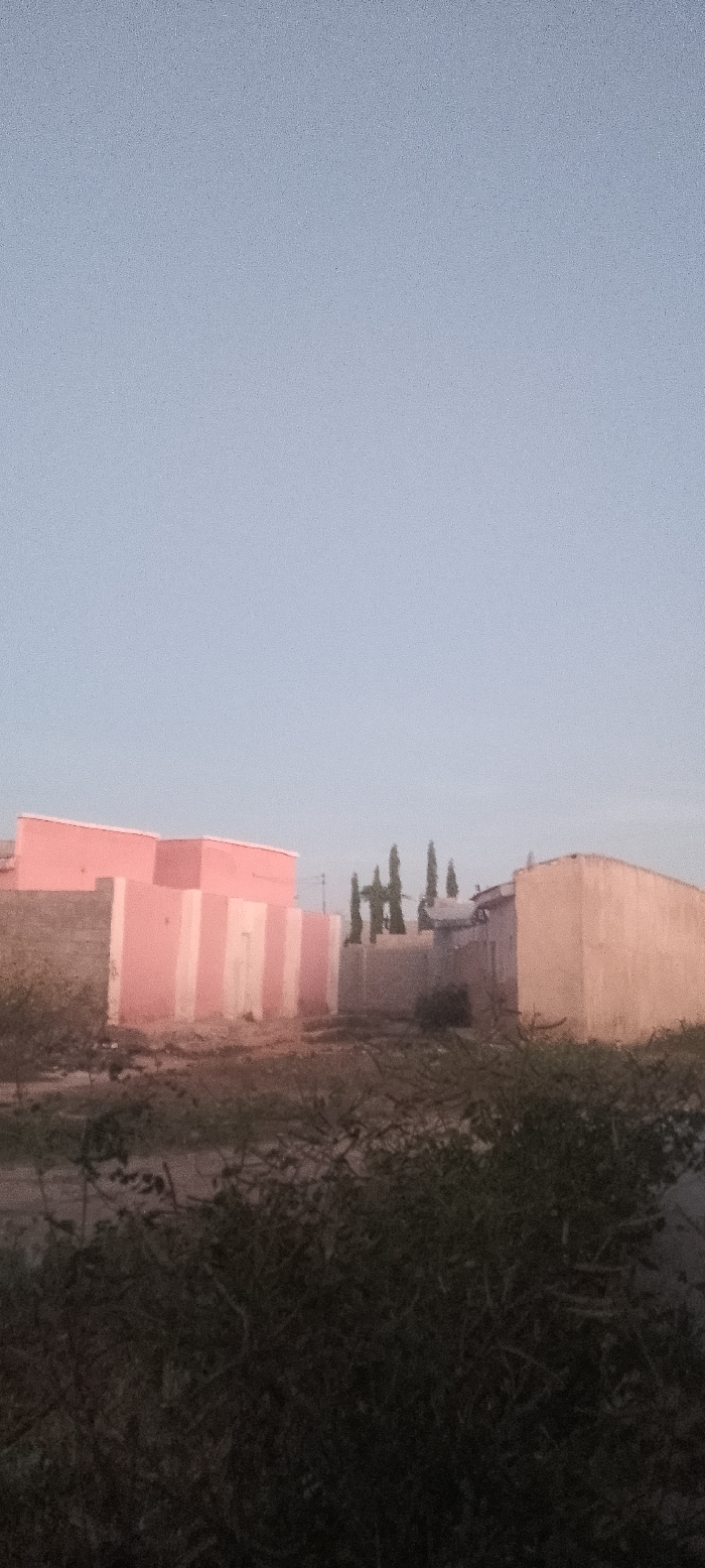 A landscape shows buildings under a vast, clear sky. The structures are predominantly pink and tan. Tall, slender trees rise in the background. The foreground is filled with a dark, dense shrubbery, blurring the transition from ground to buildings. The overall scene has a hazy, tranquil feel, likely captured during dawn or dusk.
