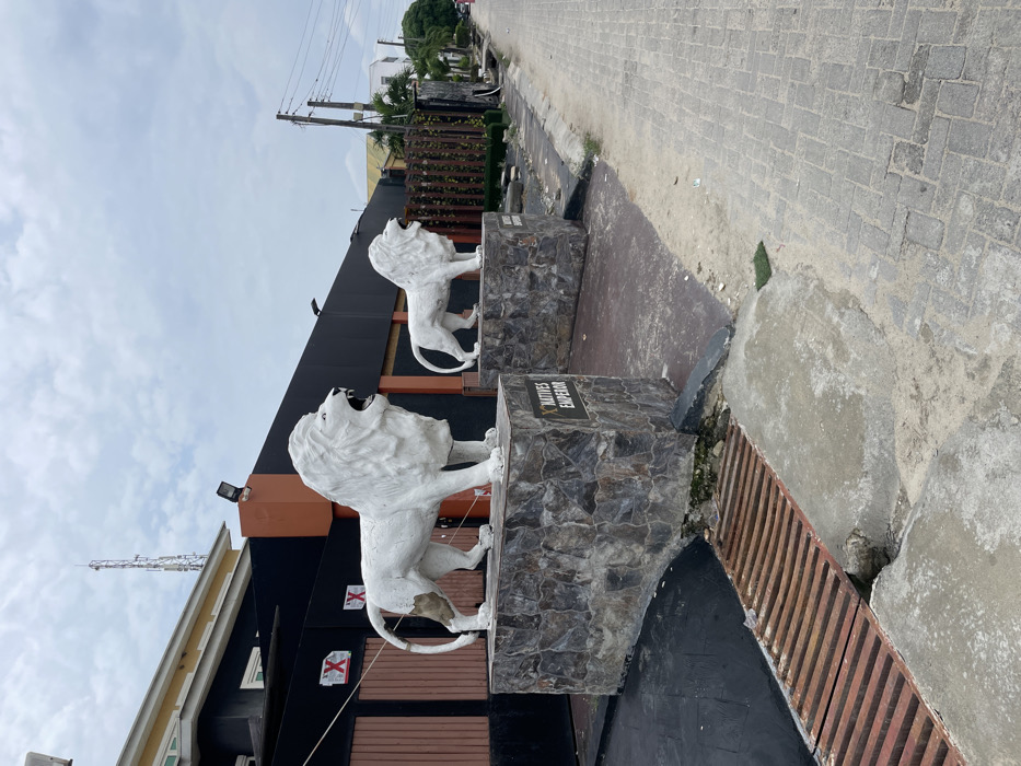 The image displays an exterior street scene in Ilado, Nigeria. Two large, white lion statues, depicted mid-roar, stand prominently on individual rectangular pedestals constructed from dark, irregularly cut stone blocks. The pedestal on the left features a black plaque with white text: "X NATIVES EMPEROR." Behind the statues, a building with a black and orange facade is visible, topped by a lighter-colored upper structure. A spotlight is mounted on an orange pillar section of the building, and a white material with a red 'X' mark is affixed to a black wall section. A tall telecommunications tower with multiple antennas rises in the background against a cloudy, overcast sky. To the right, a street paved with grey interlocking concrete pavers extends into the distance, flanked by utility poles with overhead wires and distant foliage. In the immediate foreground, a rusty metal grate covers a drainage channel, situated next to a concrete and dark-paved ground area leading towards the building's entrance. No people or live animals are present in the frame. The scene is illuminated by diffuse daylight.
