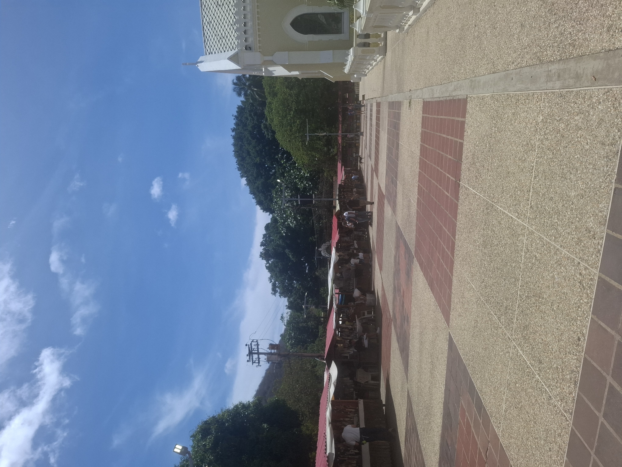 The image depicts an outdoor plaza in El Valle del Espíritu Santo, Venezuela, under a clear blue sky with sparse white clouds