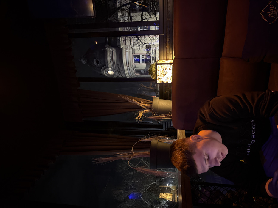 The image depicts an indoor nighttime scene, likely within a cafe or lounge, providing a view of the city of Ruse, Bulgaria. In the foreground, a male subject is seated on a reddish-brown upholstered booth. He is seen from the chest up, with short, dark hair and wearing a black long-sleeved sweatshirt featuring the "HUGO BOSS" logo across the chest. His face is illuminated from below, and his gaze is directed downwards, suggesting engagement with an object or device out of frame. The interior environment is dimly lit, with dark brown curtains framing a large window. On the window sill, two dark planters contain tall, dry, and sparse plant material. To the right, a square, decorative light fixture with a textured, reflective surface emits a warm glow. A subtle "PLAY club" logo is visible in the bottom right corner of the frame. Through the window, a prominent, well-lit, classical-style building is visible against the dark night sky. This building features a distinctive domed roof with a circular clock face, displaying a time that appears to be around 10:10 or 22:10. Below the dome, Cyrillic text "НАРОДНО ЧИТАЛИЩЕ" is clearly discernible on the building's facade. This landmark is identified as the "Angel Kanchev" National Chitalishte, a cultural institution situated in Ruse, Bulgaria. Bare tree branches are visible in the mid-ground to the left, and faint distant lights mark the urban landscape beyond.