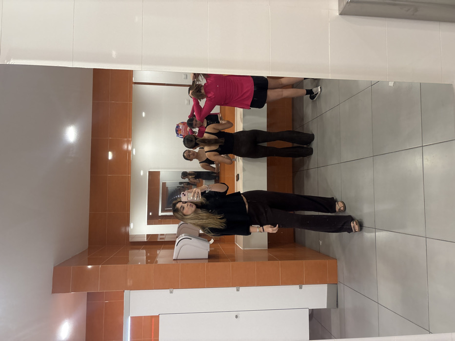 The image depicts an indoor scene within a restroom or changing facility in Chablekal, Mexico. The environment features light gray tiled flooring, orange tiled walls on the left and back, and white tiled walls on the far right and on partitions to the left. A large horizontal mirror is centered on the back wall, above a white counter or sink area. A white paper towel dispenser is mounted on the left wall, near partially visible white restroom stall doors. The ceiling is white with recessed lighting. Four young females are present, three of whom are reflected in the mirror. In the foreground on the left, a female with long, light brown hair wears a black long-sleeved top, dark brown wide-leg pants, and brown sandals. She holds a light-colored smartphone in her right hand, taking a selfie in the mirror, with her lips slightly puckered. Reflected in the mirror, from left to right: 1. A female wearing a black tank top and dark brown flared pants, with her back partially to the viewer, standing at the counter. 2. A female wearing a black tank top, facing the mirror. 3. A female with reddish-brown hair, wearing a bright pink long-sleeved top and black shorts with athletic shoes, with her back to the viewer, adjusting her hair. The subjects appear to be preparing or observing their appearance in the mirror.