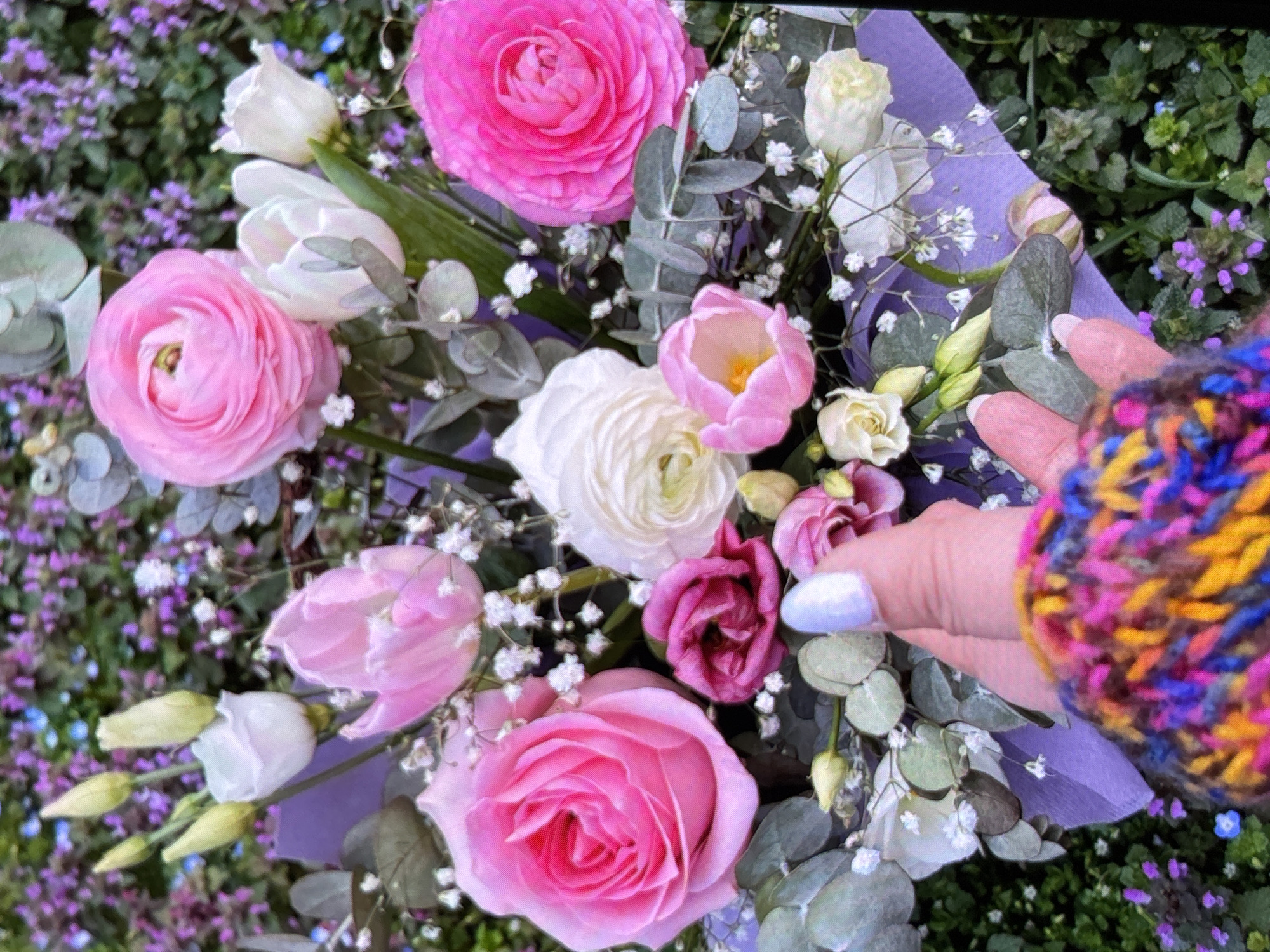 The image features a bouquet of pink and white flowers, including roses and ranunculus, wrapped in light purple paper. The flowers are surrounded by sprigs of baby's breath and eucalyptus leaves. A hand with a light blue fingernail is partially visible in the right side of the image. The bouquet is placed outdoors, against a background of green foliage with small purple flowers. The location is not discernible from the image alone and therefore no location in Sofia, Bulgaria can be determined.