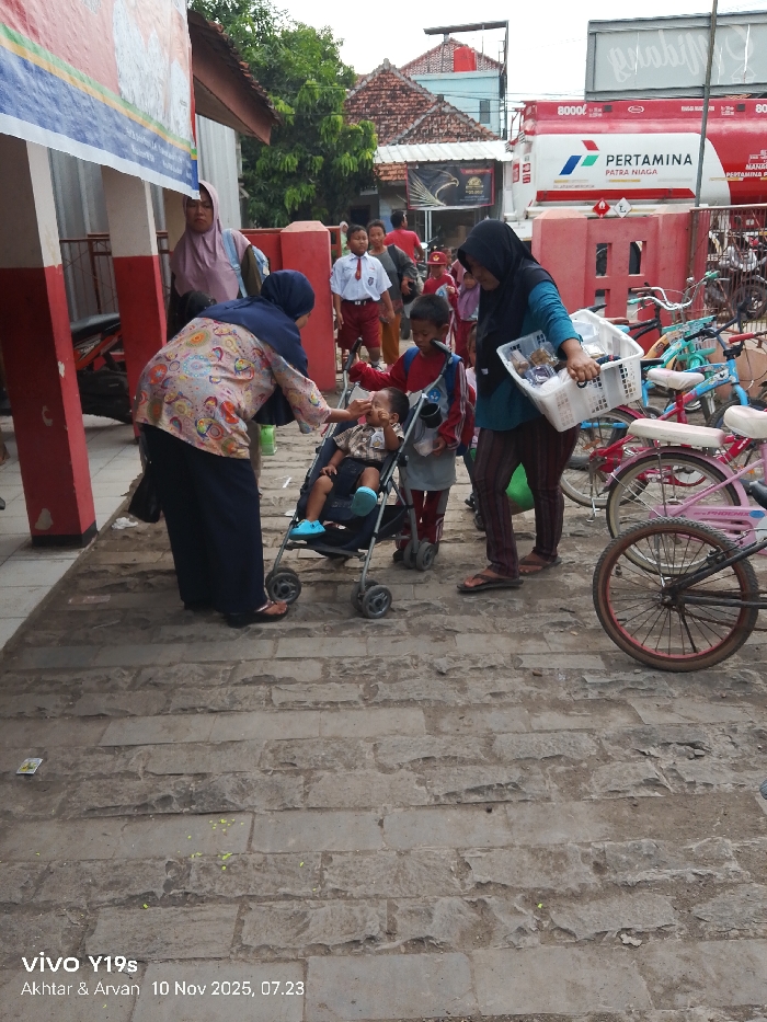 A group of people is gathered outside a building. One woman in a hijab appears to be interacting with a child seated in a stroller. Another woman, also in a hijab, stands nearby holding a white basket. Several children in school uniforms are also present in the background. Parked bicycles and a large tank truck with "PERTAMINA PATRA NIAGA" printed on the side are also visible. The timestamp "10 Nov 2025, 07.23" is at the bottom.