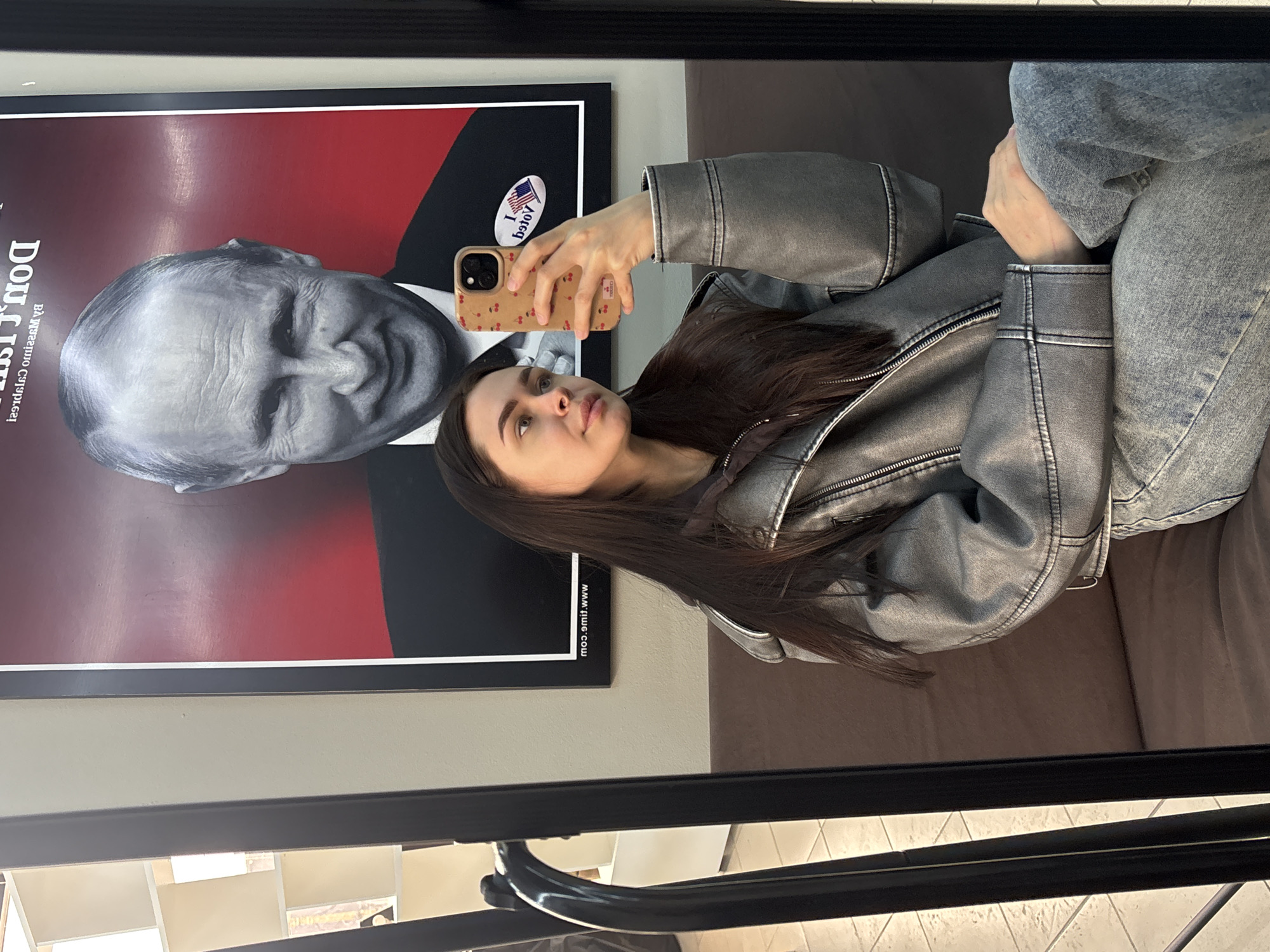 A young woman poses for a selfie in a mirror in Chaikovsky, Russia. She holds a phone with a cherry-patterned case in her right hand. The woman wears a metallic gray jacket and light wash jeans. Reflected in the mirror is a framed poster depicting Joe Biden. A "I Voted" sticker is visible on the poster. The woman's dark hair falls over her shoulder. The reflection suggests she is sitting on a brown couch. The foreground shows a window with a view of a tiled floor and a black curved structure.