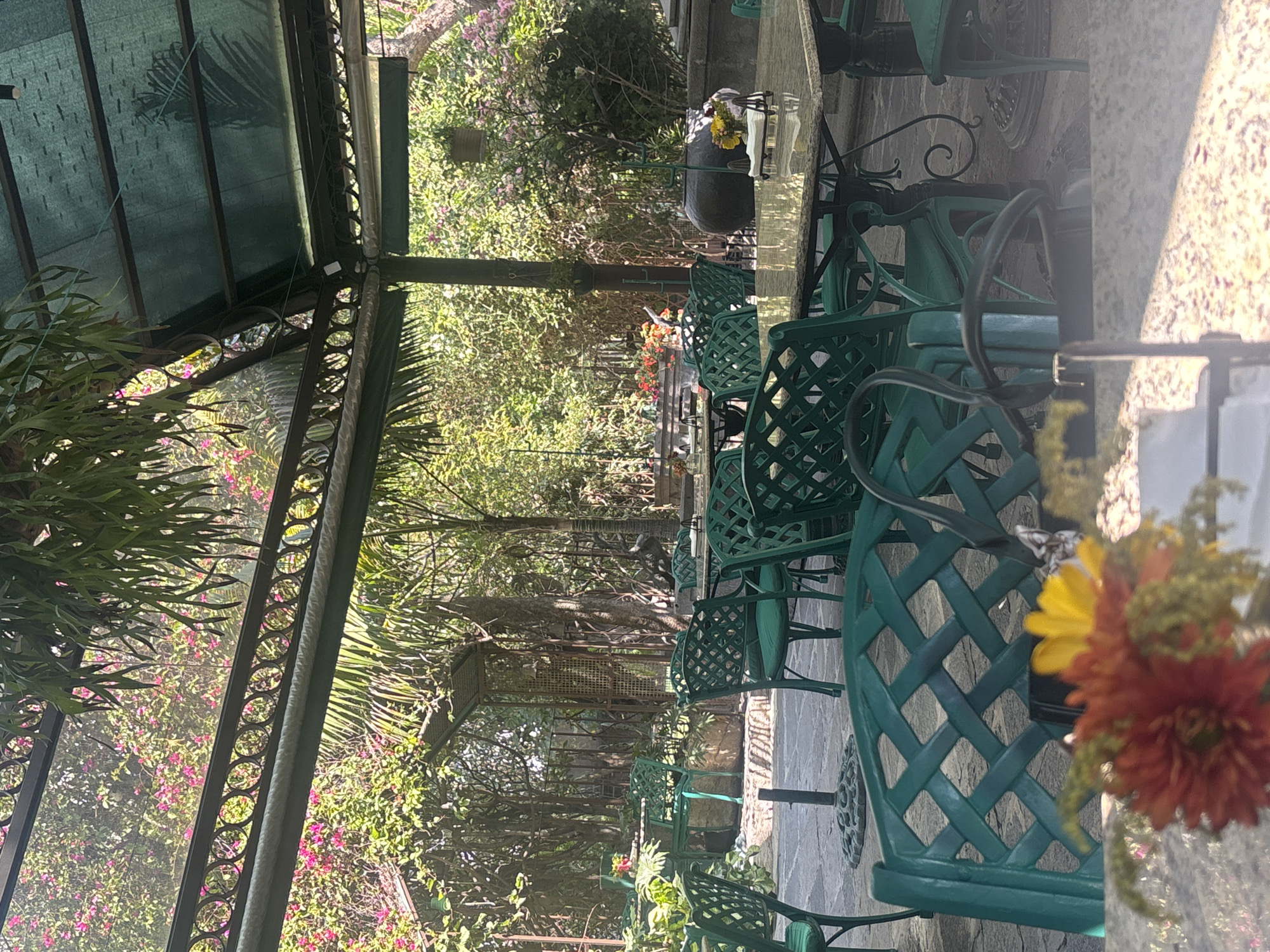 n outdoor dining area at a restaurant or cafe in Atlixco, Mexico. The space is enclosed by a metal frame structure covered with a green shade, with foliage and flowers visible around the perimeter. The dining area is furnished with green metal chairs and tables, with flower arrangements on the tables. The scene appears tranquil and inviting.