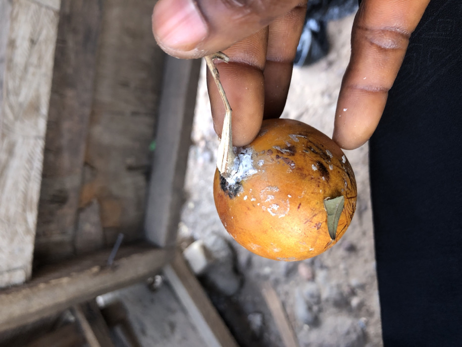 A hand holds a round, orange fruit with white mold visible on its surface. A small, dried stem is attached to the fruit near a patch of mold. There's also a green leaf embedded in the skin of the fruit. The hand holding the fruit has dark skin. The background includes what appears to be a weathered wooden structure and a dirt ground.