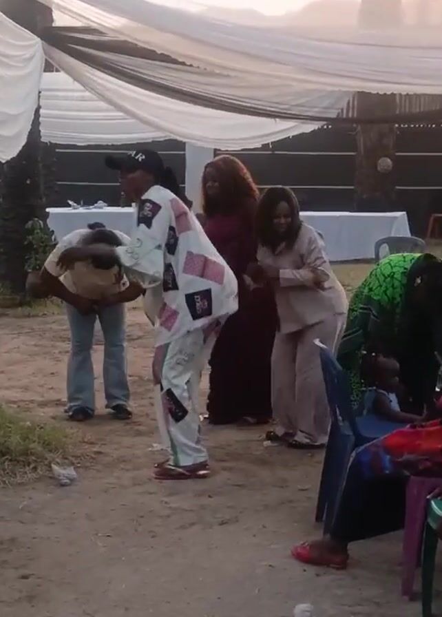 A low-angle, medium shot shows five women standing on a dirt ground, four of them moving to music. The woman in the center has dark hair in a ponytail, and a black baseball cap, and wears a white pants suit patterned with pink squares and words. To her right are two women in tan and burgundy clothing respectively, moving rhythmically. To her left is a woman in jeans and a tan shirt who is also moving rhythmically. Seated on a plastic chair is a person wearing a patterned green cloth, using their phone. Behind the women is a low table with a white tablecloth. Behind the table is a white wedding tent. The sky is pale in the background.