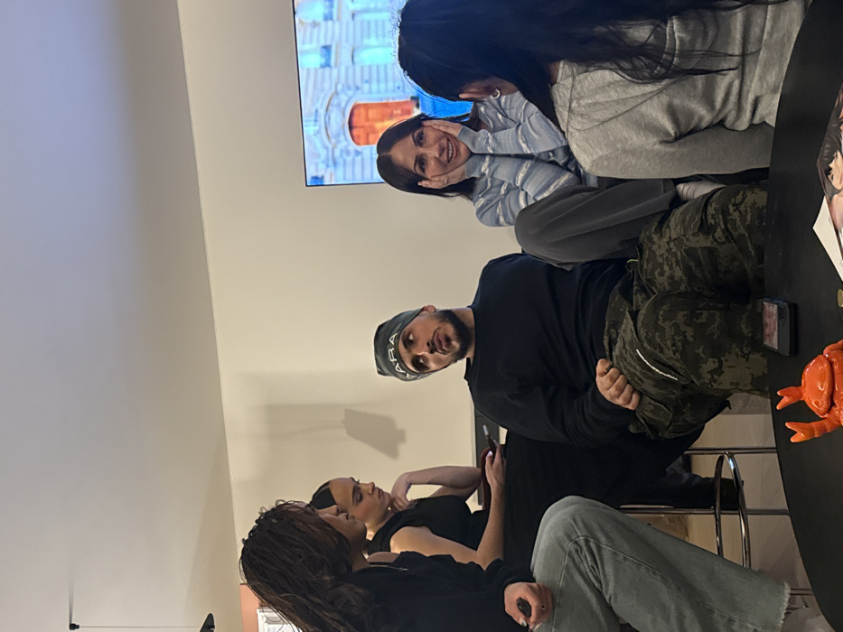 A group of people are seated at a table in a room. One man wears a beanie and camouflage pants. Another woman sits by the television smiling. Two other women are on the other side of the table. An orange crab is visible on the table.