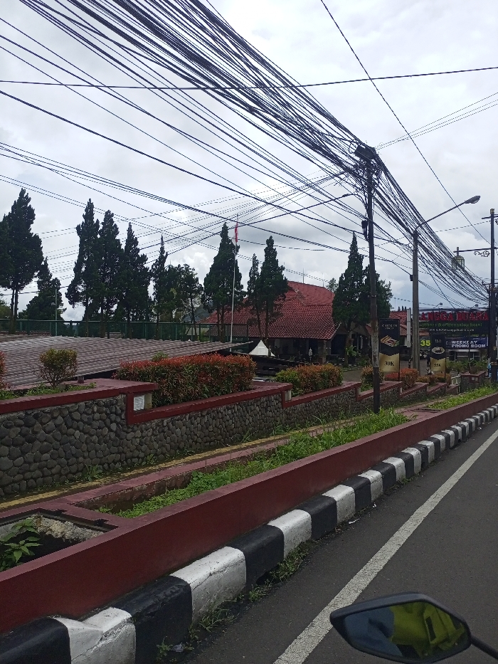 The image captures a roadside view in Meyong, India, under an overcast sky. In the immediate foreground, the lower right section displays a portion of a motorcycle's rearview mirror. The ground consists of an asphalt road featuring a white lane divider line, bordered by a curb painted with alternating black and white blocks. Adjacent to the curb is a red-painted concrete planter containing green vegetation, followed by a retaining wall constructed from dark grey, rough-hewn stones. This wall is topped with a red-painted concrete ledge, from which a series of mature bushes with reddish-green foliage grow. In the midground, beyond the retaining wall and bushes, multiple structures are visible. A long, low building with a dark-tiled roof is present, situated in front of a larger building characterized by a distinct red-tiled, multi-gabled roof. Numerous tall, slender evergreen trees are interspersed around these buildings, with a line of them forming a backdrop. A flagpole bearing a red and white flag stands prominently among the trees. To the right, running parallel to the road, a utility pole is heavily laden with a dense bundle of black electrical and communication cables. Further down the road, another utility pole supports a street lamp. A large, dark-colored billboard, partially obscured by the utility pole, displays white text and graphics, including "HOTEL & RESORT" and "WEEKEND PROMO ROOM," with associated pricing like "35K" and "30K". The background reveals faint outlines of distant hills or elevated terrain beneath the cloudy conditions. No individuals are visible or engaged in any discernible actions or interactions within the frame.