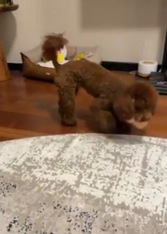 In a brief, indoor video, a brown poodle walks across a hardwood floor, then turns to walk across a patterned, light-colored rug