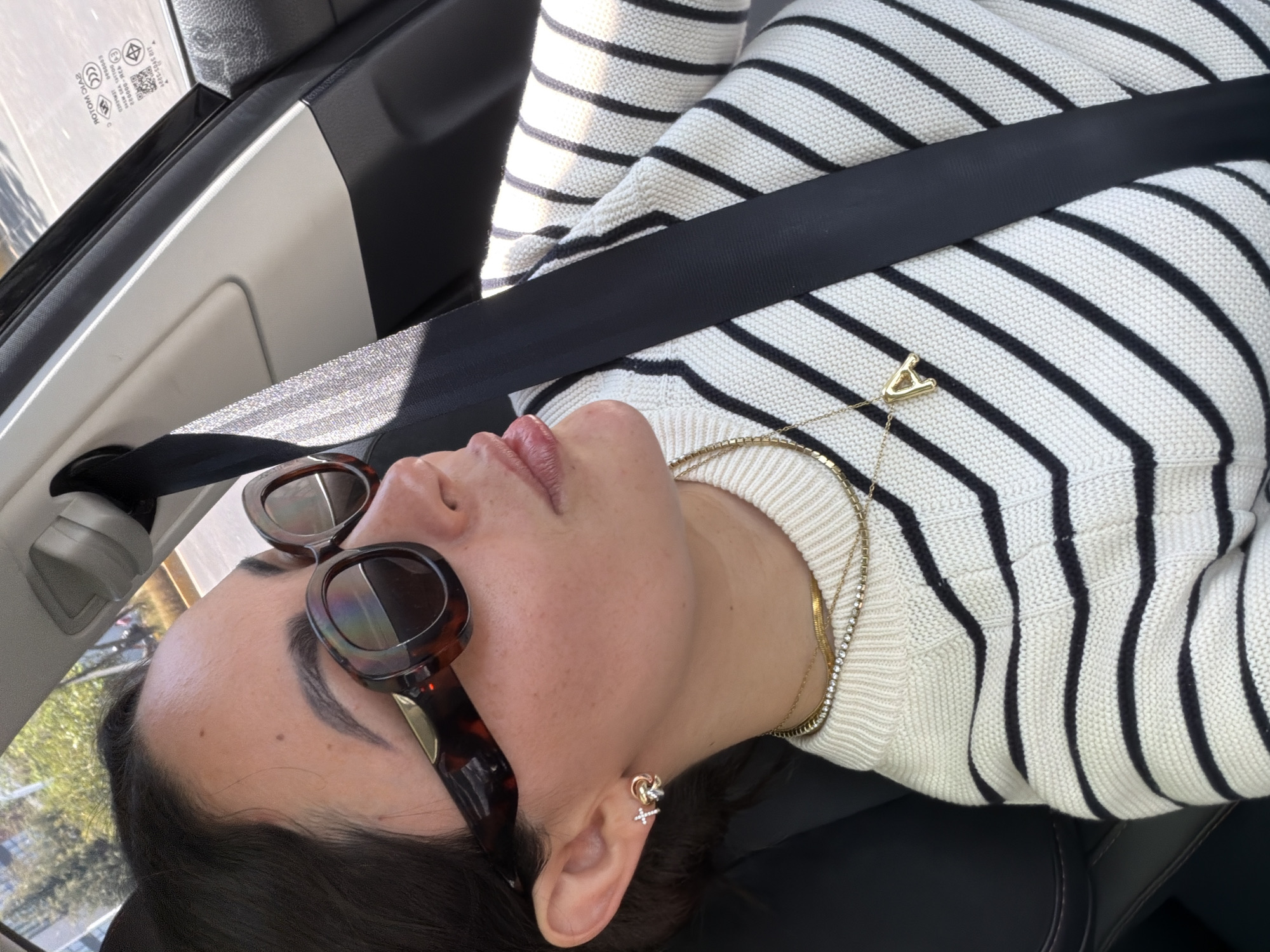 An adult individual is seated in the passenger compartment of a vehicle located in San Bernardino Tlaxcalancingo, Mexico. The person, presented in a close-up profile view, is wearing large, oval, dark-rimmed sunglasses and a white knitted sweater with black horizontal stripes. A black seatbelt is correctly fastened across the individual's chest. The visible left ear displays two distinct earrings: a small white cross stud and a multi-tone interlocking ring design. Multiple gold-toned necklaces are worn, including a choker with clear stones and a longer chain featuring a prominent gold capital "A" pendant. The vehicle's interior features dark seating and light-colored trim. Through the passenger window, reversed text, including "SAID ROTOЯ" and a QR code, is visible. The exterior environment, observed through the window, shows blurred green foliage and a paved road surface under bright daylight.