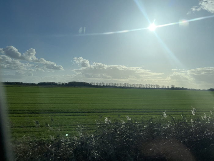 The image depicts a rural landscape in West Suffolk, United Kingdom, under a bright, clear sky. The scene is dominated by vast, flat green agricultural fields, likely cultivated crops, stretching horizontally across the midground. Distinct parallel linear patterns are visible within the fields. Along the distant horizon, a long, thin line of tall, deciduous trees, appearing leafless, forms a dark silhouette against the sky. To the right of this linear tree line, a denser cluster of woodland is visible. The sky occupies the upper two-thirds of the frame, displaying a light blue hue with scattered white cumulus clouds. A strong, bright sun with a prominent lens flare is positioned in the upper right quadrant, illuminating the scene. The immediate foreground consists of a dark, blurred strip of dense foliage, appearing as bushes and tall grasses, with some lighter, wispy elements catching the sunlight. No people, discernible objects, actions, or interactions are present. The perspective suggests the photograph was taken from a vehicle or from behind foreground vegetation.