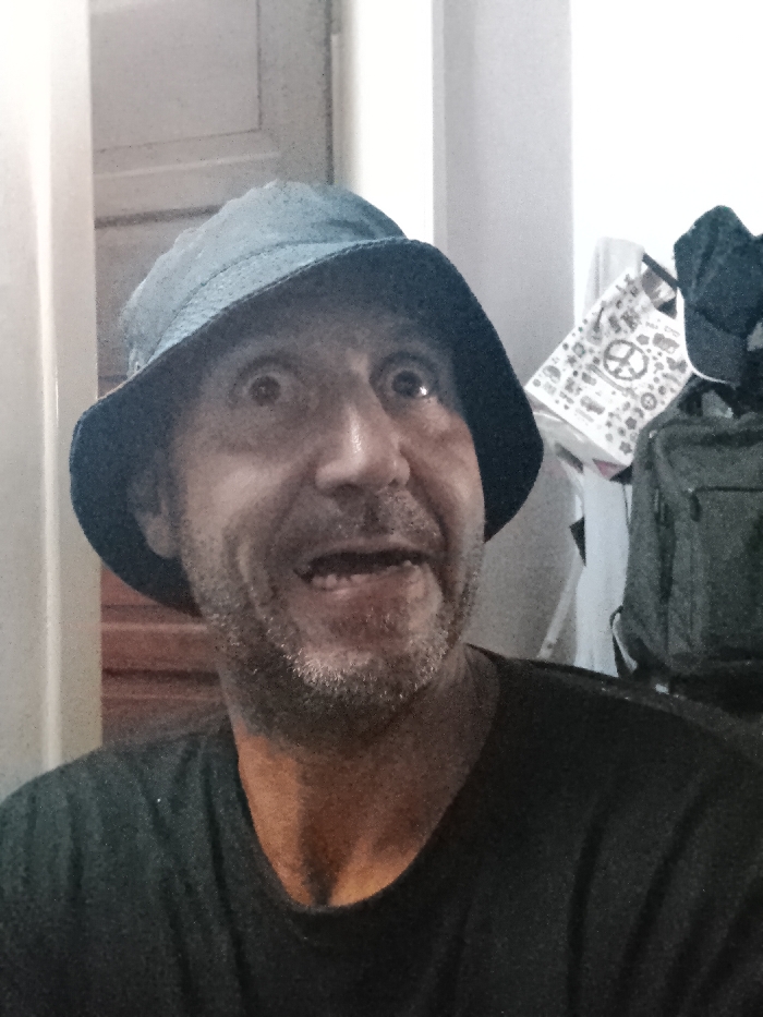 An adult male subject is depicted in a close-up, head-and-shoulders portrait, likely indoors. He has light-colored stubble on his face and is wearing a dark blue bucket hat and a dark-colored t-shirt. His eyes are wide open, pupils dilated, and directed upwards and to the viewer's right. His mouth is open in a wide, exaggerated smile, revealing teeth. The background consists of light-colored walls or structures on the left and right. To the right of the subject's head, a dark backpack is visible, partially obscured. Above and to the left of the backpack, a white bag or paper with black graphics, including a peace symbol, is visible. The lighting is uniform. The location is Unknown, Unknown.