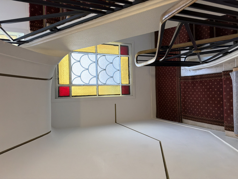 The image displays an interior view of a curved staircase within a building located in Ivry-sur-Seine, France. The perspective is from an upper level, looking down several flights of stairs. The steps are covered with a deep red carpet featuring a repeating pattern of small tan geometric shapes; the edges of the steps visible beside the carpet appear to be light-colored, possibly white marble or painted concrete. A black metal balustrade with a curved, polished brass-colored handrail runs along the right side of the staircase. The left wall is plain white and features a thin, horizontal brass-colored handrail. Centrally located on a white wall at a landing is a rectangular stained-glass window. This window contains sections of yellow, red, and white glass. The central white panels are arranged in a scallop-shell or fan pattern, framed by clear yellow textured glass, with smaller red rectangular panels at the corners and along the top and bottom borders. The ceiling above the stairwell is white and follows the curve of the architecture, accented by thin, dark-colored trim lines. No individuals are present, and no specific actions or interactions are depicted.