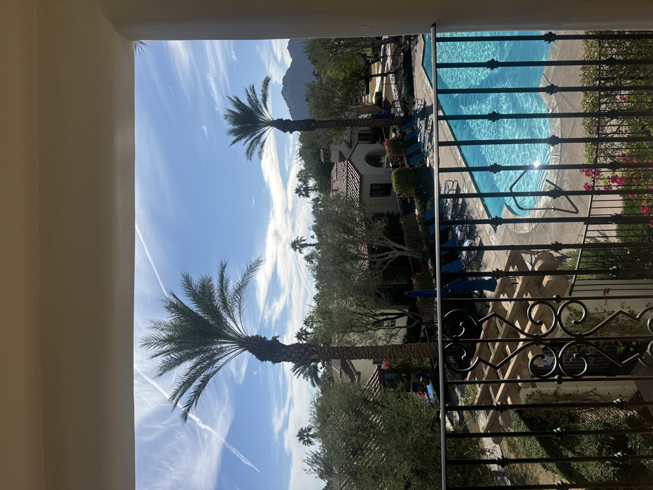 The scene depicts a sunny, clear day view from an elevated balcony in La Quinta, United States