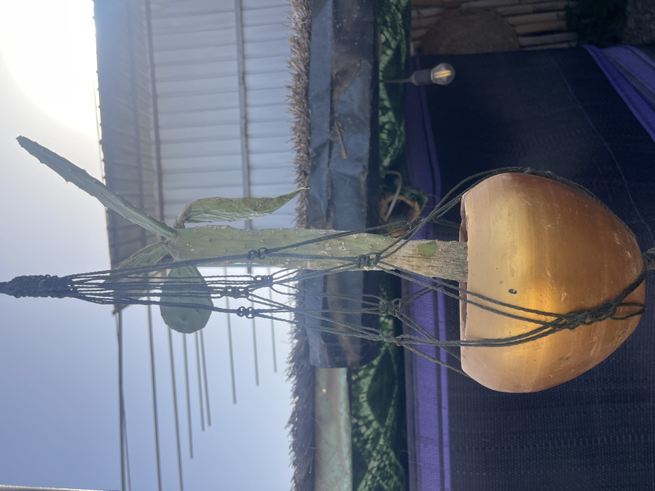The image displays an outdoor scene in Bar Jirgi Summa, Nigeria, featuring a hanging plant under bright sunlight. In the foreground, a spherical, golden-colored pot containing a columnar cactus-like plant is suspended by a black macrame hanger. The plant exhibits multiple green, flattened segments, one extending vertically upward, another horizontally to the left, and a third, appearing desiccated, hanging downwards to the right. The upper left sky is clear blue. In the background, a light-colored corrugated metal roof is visible above a lower structure with a dark thatched roof. Beneath the thatched roof, dark sheeting and purple fabric are discernable. An exposed filament light bulb hangs from a wire in the lower right background, adjacent to a section of woven material, possibly a wall. No individuals are present.